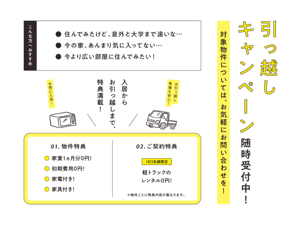 THE ROOMでは新入生はもちろん、引越しを考えている在学生に向けたキャンペーンも実施中。初期費用・家賃1ヶ月無料、軽トラックレンタル無料など、お得がいっぱい。
