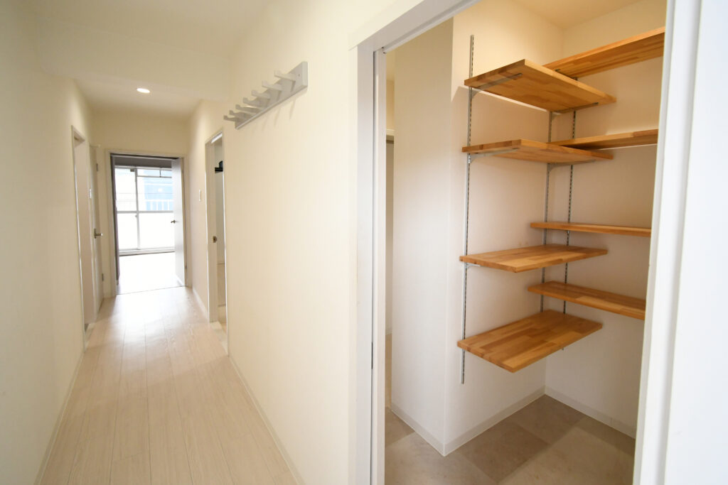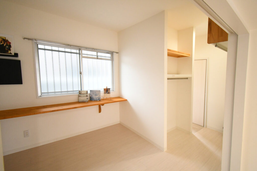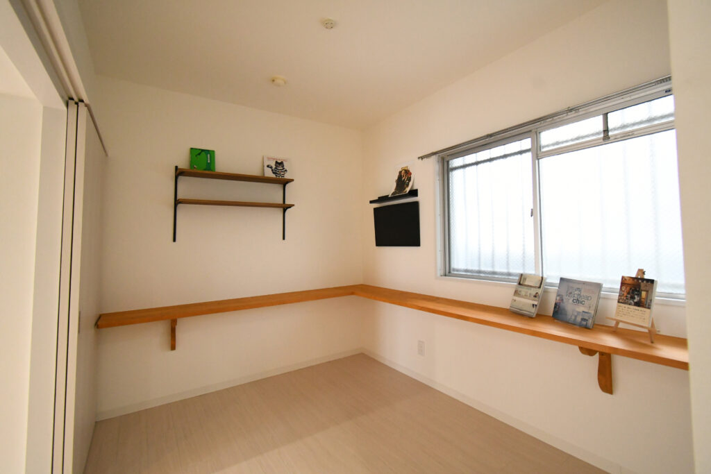 LDKの横にはカウンター付きの洋室がゆるくつながり、廊下側からも出入りできるウォークスルーのつくり。
