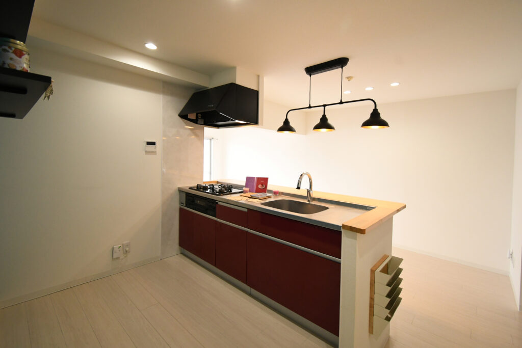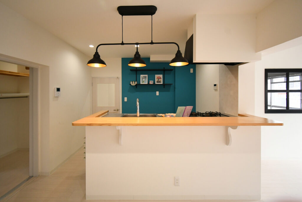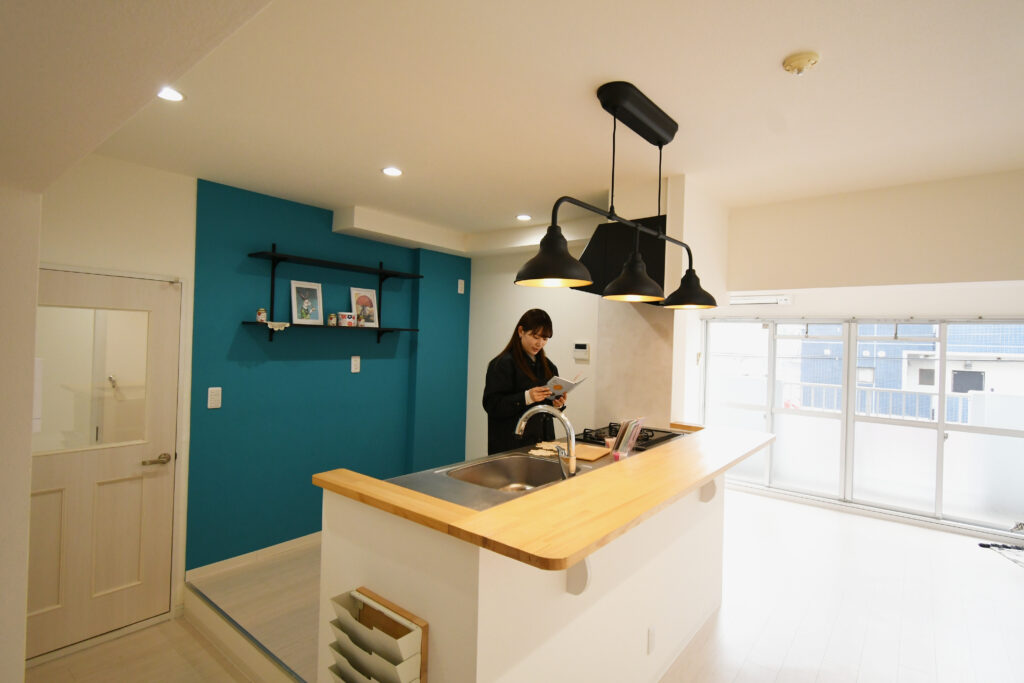 キッチンの深い赤の面材と、青いアクセントウォールが映えるおしゃれな仕様。